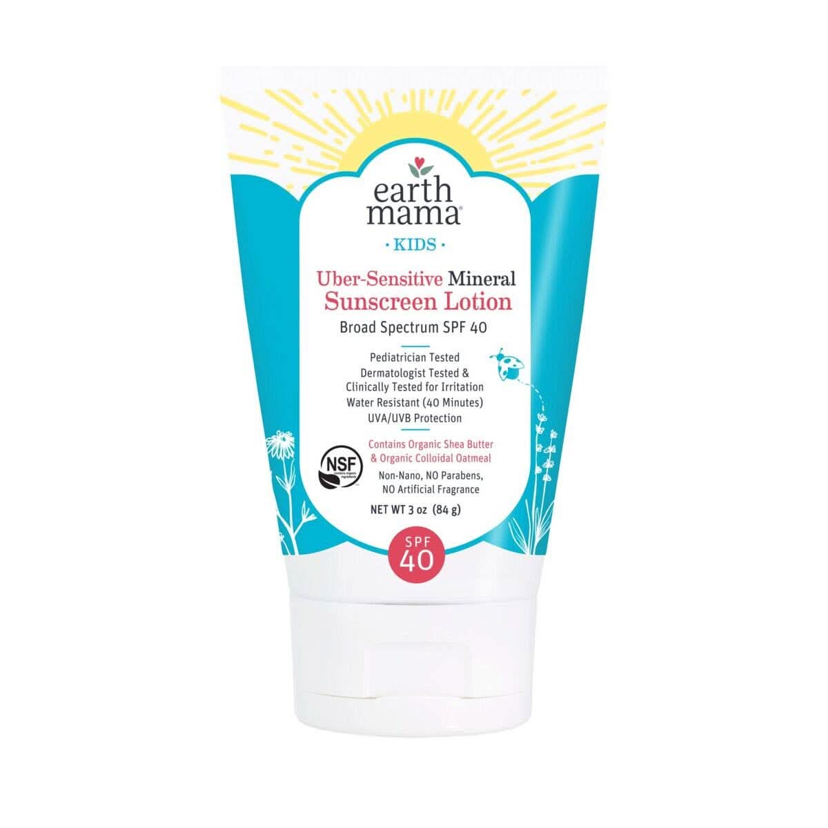 Safe for the rashy-est of skin, Earth Mamaβs creamy Uber-Sensitive Mineral Sunscreen Lotion (Broad Spectrum Sunscreen SPF 40) contains plenty of calming organic colloidal oatmeal and organic shea butter. Thoughtfully formulated so that itβs non-irritating and gentle for sensitive skin, this is a reef-friendly, non-toxic sunscreen with non-nano zinc β that sits on top of the skin rather than being absorbed, so it can scatter sun rays. Size: 3 oz. net wt. (84 g).